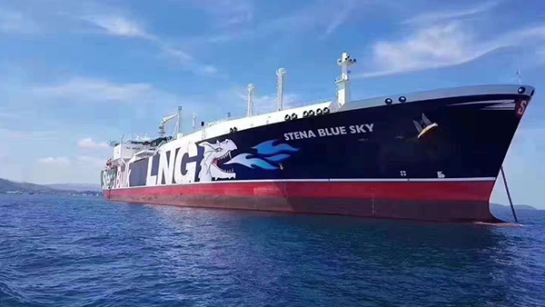 2018年8月7日,世界上美麗的LNG“藍天”號靠泊新奧舟山LNG接收站海港。“藍天(STENABLUE SKY)”輪船籍巴拿馬,船長285.40米,寬43.40米,載14.5萬立方LNG由卡塔爾開航駛來舟山港。該輪以其獨特的外觀和炫麗的彩繪圖案贏得全球美的LNG船舶稱號。